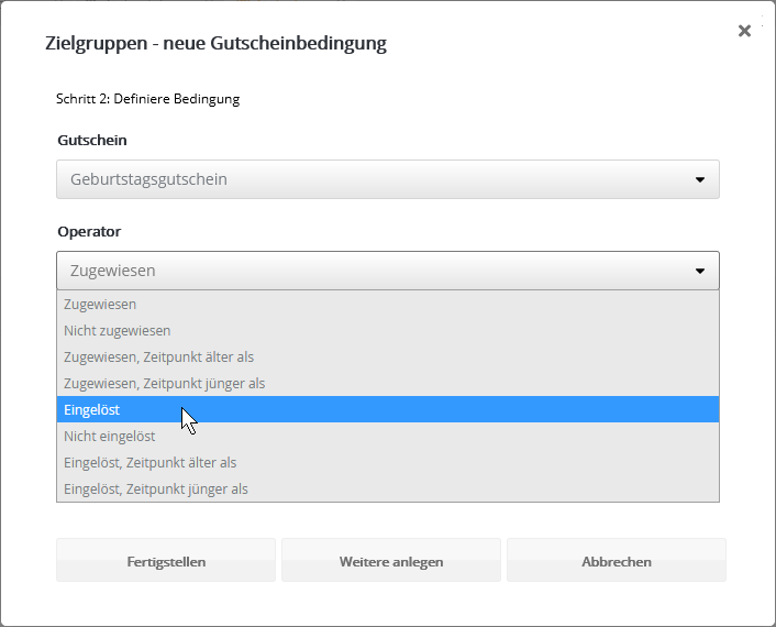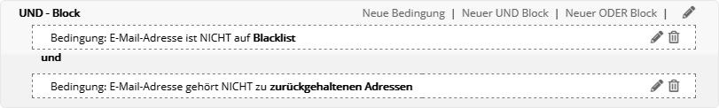 Insbesondere nach dem Kopieren einer vorhandenen Zielgruppe kann das sinnvoll sein, wenn die identischen Abonnenten in Original und Kopie nicht gewünscht sind. Bedingung anhand GutscheinFiltern Sie Abonnenten danach, ob und in welchem Zeitraum die Zuweisung oder Einlösung eines Gutscheins stattfand. Tipp: Um zugewiesene Gutscheine als eingelöst zu markieren, nutzen Sie entweder die Webservice-Funktion 'RedeemVoucherByCode' oder importieren in der Gutscheinübersicht eine CSV-Datei mit den eingelösten Gutscheincodes. Bedingung anhand SelektionMit diesem Bedingungstyp nutzen Sie eine per Webservice angelegte Selektion von Abonnenten als LCC Newsletter-Tool-Zielgruppe. Der Bedingungstyp ist nur dann sichtbar, wenn per Webservice mindestens eine Selektion angelegt wurde. Das Besondere: In einer Selektion werden Abonnenten anhand einer Liste von IDs gruppiert. So lässt sich eine extern getroffene Abonnentenauswahl als Zielgruppe nutzen, ohne dass in den LCC Newsletter-Tool-Abonnentendaten ein gemeinsames Merkmal vorliegen muss. Die Details entnehmen Sie bitte der Webservice-Dokumentation, die wir Ihnen gern zusenden. Bedingung anhand des Empfängers (geplant)Diese Bedingung entscheidet, ob ein Abonnent als Empfänger eines bestimmten Mailings vorgesehen war oder nicht. Das bedeutet, dass er in einer Abonnentenliste bzw. Zielgruppe für ein bestimmtes Mailing steht, welches versandt wurde. Im Unterschied zur letztgenannten Bedingung wird der tatsächliche Empfang jedoch nicht geprüft. Es sind auch alle Empfänger enthalten, die das Mailing z. B. aufgrund von Bounces, Blacklists oder serversseitigen Spamfiltern nicht empfangen haben. Bedingung anhand des Empfangens (zugestellt)Diese Bedingung entscheidet, ob jemand ein bestimmtes Mailing empfangen hat oder nicht. Das Mailing gilt als empfangen, wenn der E-Mail-Server des Abonnenten eine positive Rückmeldung erteilt hat. Im Schritt nach dem Empfang ist es dennoch möglich, dass das Mailing beim Empfänger in einem Spamordner landet. Bedingung anhand des BounceverhaltensDamit legen Sie Bedingungen anhand der Zustellungen oder Nichtzustellungen eines bestimmten Mailings an. Bedingung anhand Blacklist bzw. Zurückgehaltener AdressenAbonnenten, deren E-Mail-Adresse auf einer Blacklist oder der Liste der zurückgehaltenen Adressen steht, werden automatisch vom Versand ausgeschlossen. Dieselben* Abonnenten lassen sich per Zielgruppe filtern, etwa um sie beim Export Ihrer Abonnentendaten ebenfalls auszuschließen. Die kombinierte Zielgruppe sieht wie folgt aus: