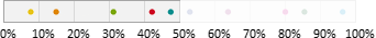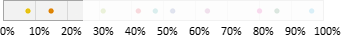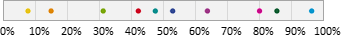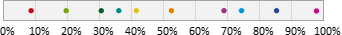 Auswahl-Wahrscheinlichkeit in ProzentGeben Sie einen Prozentwert zwischen 0 und 100% ein. Mit dieser Wahrscheinlichkeit gehört ein Abonnent zur Zielgruppe. Beispielsweise bewirkt ein Wert von 25%, dass ungefähr (siehe Hinweis) ein Viertel aller Abonnenten zur Zielgruppe gehören. Dazu verteilt LCC Newsletter-Tool alle Abonnenten auf einem Zahlenstrahl zwischen 0 und 100%. Bei 10 "bunten" Abonnenten könnte eine Variante so aussehen: