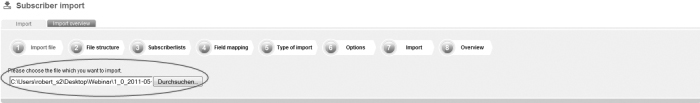 Save the file as a file with the feature 'CSV (Comma delimited)'. Apple user: If you own an apple computer, you will have to safe the file as 'CSV-Windows'. LCC Newsletter-Tool does not run files in the Mac format. Step 1 – Import fileOn the navigation bar click on 'Subscribers' and then go to the navigation subitem 'Import'. This is the way how you get to the menu-guided import function of LCC Newsletter-Tool. First, you will have to choose the file which you want to import; |