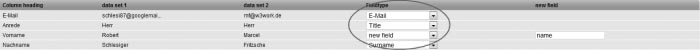 if the first line of your address file contains (as shown in the example above) the column headings, leave the item 'First line contains column headings' marked . Otherwise, if your address file starts right away with the subscriber data, unmark this option. Step 3 – Subscriber ListsChoose the subscriber list to which you want to import the addresses. Subsequently click on 'Next'. Step 4 – Field MappingNow you are asked to match the field names of your subscriber data with those of LCC Newsletter-Tool. In order to do so, please choose in the drop down menus the associations which correspond to field information displayed to the left of these menus. If there does not exist a matching subscriber field, choose 'New Field' and enter a name for the subscriber field that needs to be created. Click 'Next'.