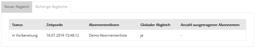 Daraufhin startet LCC Newsletter-Tool den Abgleich. Im Reiter 'bisherige Abgleiche' können Sie den Status des Fortschrittes einsehen. Nach Fertigstellung wird Ihnen die Anzahl der ausgetragenen Abonnenten angezeigt. |