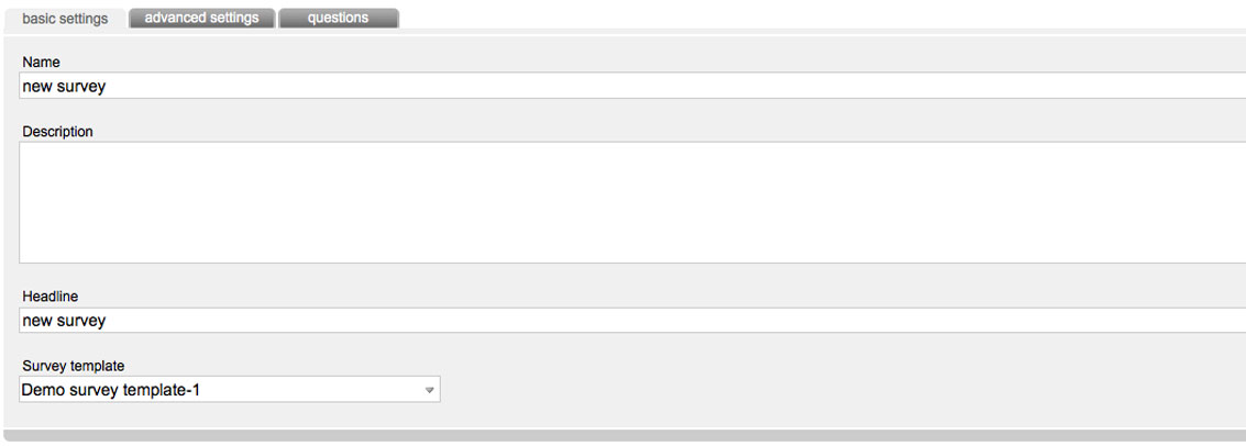 Click 'create new survey' and a popup will be open. Enter a name and an optional description. Click 'OK' to save your settings.