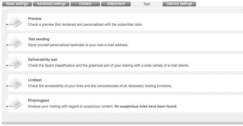 Having finished your newsletter, LCC Newsletter-Tool offers you numerous testing possibilities. This helps you to optimize your mailing and achieve maximum success before actual dispatch. You can get to the testing functions by choosing the tab 'Test' in the menu in which you edit your mailing. Following tests are available: |