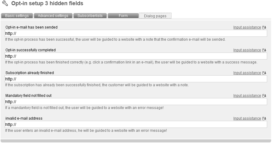 Now enter a name and an optional description for your optin setup. Then choose the 'mode' (important). The following modes are supported by 'LCC Newsletter-Tool': Double Opt-in with confirmation e-mail (recommended as the only legally secure login variant): Interested party visits a website with an optin setup form. He enters his data into the form. He gots an e-mail with content like this: „Thank you for your optin. Please confirm the registration confirmation link to complete your registration.“ He clicks the link. Registration is completed. He gots a „welcoming“ e-mail. You can integrate information about your company and a certain design as well. Double Opt-in: Like described before, but without sending of a „welcoming“ e-mail. Confirmed Opt-In: Nach Anmeldung auf der Webseite wird sofort eine automatische Begrüßungsnachricht versendet. Single Opt-in: No e-mails will be send. There just will be a message in your browser, that registration was successfull. According to the mode you've choosed, you have to adapt different sub-options. In Tab 'advanced settings' you can deposit your e-mail address in field 'e-mail forwarding', to be informed about new subscribers. In field 'mailing for later delivery' you can determine your last sended newsletter. All new subscribers will receive your last mailing and don't have to wait for another one. To protect your optin-form against abuse, activate the invisible captcha . Captchas are often used to check if petitions are produced by a machine (robot, short: bot) or a real person. Bots are often used abusive to generate masses of subscriptions. Choose your favorite subscriberfields, which should be filled in in next tab 'Form'. After clicking 'Add subscriberfield' a pop up appears, where you can select and add subscriberfields to your optin-form. Furthermore you can add one or more subscriberlists as option(s) in a ceckbox through the button 'add subscriberlist'. Click 'sort formfields' to edit order of your fields. Click 'test form' to check your form by a preview of your optin-form. Next tab: 'Dialog pages':