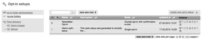Through 'Setups' and 'Optin Setup' you can create forms, which can be included into your website. So interested parties can login automatically on your website for your subscriberlist(s). Please note: Requirement for a successfull 'optin setup' is to create an e-mail with type 'dialog mailing' for registration confirmation and welcoming, which got the status 'activated'. Otherwise those mailings will be lacking in the shortlist of mailings which you can choose for your optin setup. For an esier start LCC Newsletter-Tool gots a „Demo optin setup“ for you. Created optin setups can be 'opend' afterwards for editing, 'moving' to another folder or 'deleting'. If you have moved an optin setup into another folder, click 'open folder' to get into. Create new Optin setup |