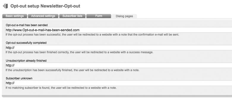 Enter a name and an optional description. Choose the 'mode' (important). The following modes are supported by 'LCC Newsletter-Tool': Double-optout with confirmation e-mail: after unsubscribe from your website or your newsletter a confirmation email will be send automatically. Optout will be activated after clicking the confirmation link in this email. After successful unsubscription the former subscriber will get a last email („You unsubscribed successfully of our newsletter.“) Double Optout: Like described before, but without sending of a „successful unsubscription“ e-mail Confirmed Opt-Out (recommended): After unsubsubscription on your website or in your newsletter a „successful unsubscription“ email will be sended immediately. Single Optout: No e-mails will be send. There just will be a message in your browser, that optout was successfull. In Tab 'advanced settings' you can deposit your e-mail address in field 'e-mail forwarding', to be informed about unsubscriptions. Tab 'subscriberlists': Choose your favorite subscriberlist(s), where all unsubscriptions should be logged out. Select the subscriberfields, which should be filled out by your subscribers in tab 'Form'. After clicking 'create form fields' a popup appears, where you can choose and add subscriber fields to your form. Click 'sort formular fields' to arrange your fields. Click 'test form' to open a new tab in your browser with a preview of your form. Source Code of your website is genereated by 'LCC Newsletter-Tool' by clicking 'Formular soruce code'. A popup appears with your source code. Last tab: Dialog pages |