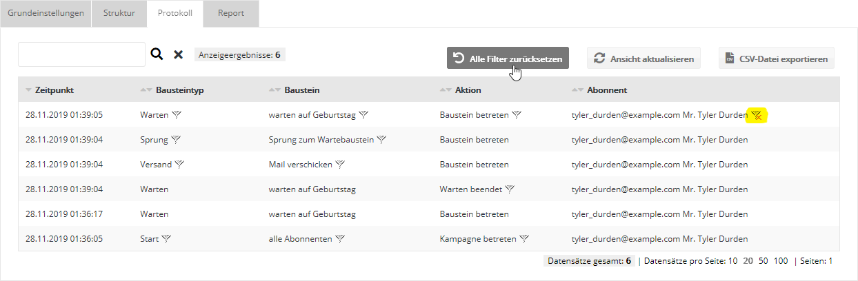 Der Protokoll-Reiter erscheint, sobald die Kampagne aktiviert ist. Hier sehen Sie den detailierten Fortschritt jedes Kampagnen-Teilnehmers. Die Protokolleinträge werden für die Dauer von 365 Tagen vorgehalten.