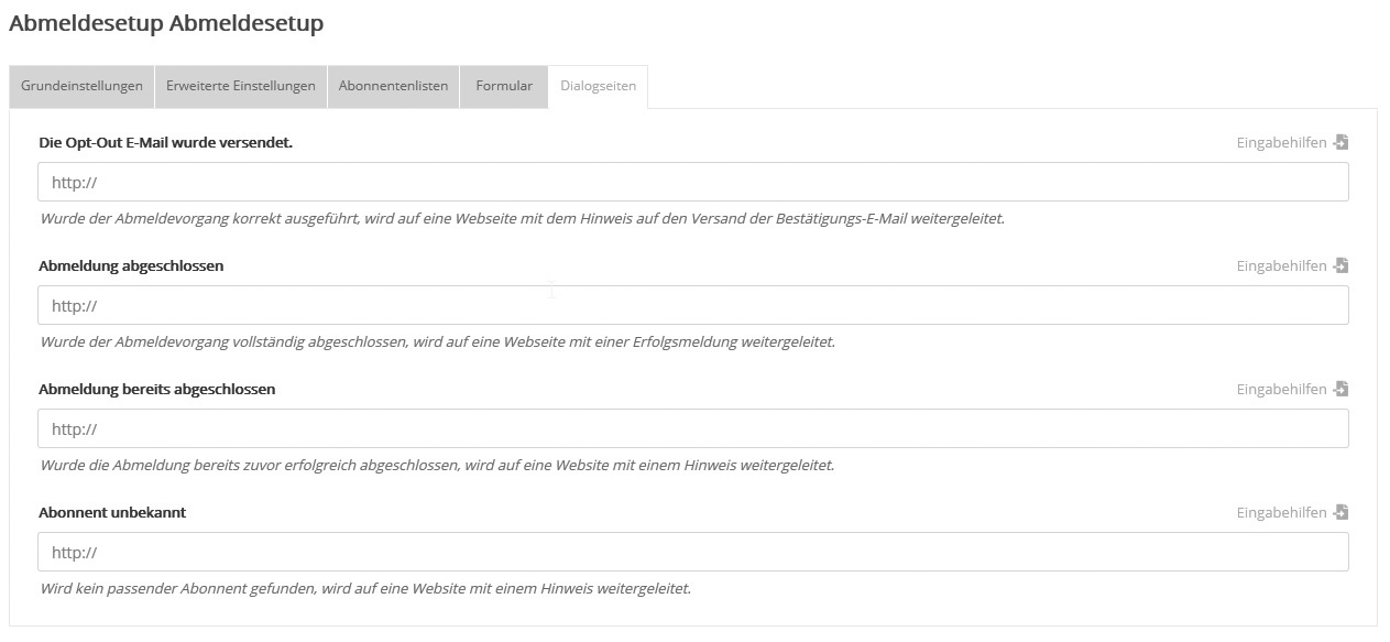 AbonnentenlistenJe nachdem, ob die Abmeldung per Newsletter-Link oder per Website-Formular stattfindet, wird der Abonnent aus folgenden Listen abgemeldet: Variante 1: Abmeldelink im NewsletterFür Standardmails gilt: Zusätzlich zu den auf dem Reiter 'Abonnentenlisten' gewählten Listen findet die Abmeldung auch in den angeschriebenen Listen statt. Für Kampagnen- und Dialogmails gilt dieser Zusatz nicht, da diese nicht an eine bestimmte Liste verschickt werden. Variante 2: Abmeldeformular auf WebsiteDie Abmeldung findet in den unter 'Abonnentenlisten' markierten Listen statt, und wenn vorhanden, dann auch in den direkt im Formular zur Auswahl durch den Nutzer angebotenen Listen (siehe nächster Abschnitt 'Formular'). Beides gleichzeitig ist nicht möglich. Das heißt: Sobald Sie eine Liste im Reiter 'Abonnentenlisten' markiert haben (und damit fest vorgeben), kann sie nicht gleichzeitig im Abmelde-Formular (ab)wählbar sein. Im dem Fall wird sie automatisch aus dem Formular entfernt und umgekehrt. Sonderfall beim Abmeldeformular: Ist keine Liste zur Abmeldung markiert und auch im Formular keine enthalten, dann findet die Abmeldung in allen Listen statt. Damit wird der Abonnent auch aus der 'Abonnentenverwaltung' entfernt. FormularHier erstellt LCC Newsletter-Tool automatisch den Quellcode für ein Abmeldeformular, das Sie auf Ihrer Website einbinden können. Den Inhalt des Formulars stellen Sie per Drag&Drop zusammen. Die Bedienung ist identisch zum Anmeldeformular-Editor. Nach Klick auf den Button 'Test des Formulars' wird Ihr neues Abmeldeformular angezeigt und die Funktion lässt sich anhand realer Abmeldungen testen. Geben Sie gültige und ungültige Abonnentendaten ein, um die entsprechenden Textmeldungen bzw. Dialogseiten zu prüfen. Ein während des Tests abgemeldeter Abonnent lässt sich unter 'Abonnenten' -> 'Abmeldungen' wiederherstellen. --> Hinweis zu Abmeldungen beim Testversand: Solange es sich um den Testversand eines Mailings handelt, findet bei Klick auf den Abmeldelink keine Abmeldung statt. Stattdessen wird lediglich eine Bestätigung angezeigt, ob das Abmeldesetup korrekt eingerichtet wurde. Erst beim späteren realen Versand findet eine tatsächliche Abmeldung statt und es erscheint die von Ihnen eingestellte Dialogseite, die Sie unter 'Formular testen' jederzeit testen können. Dialogseiten |